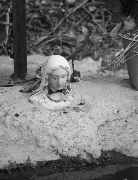 The head of a Virgin Mary buried in concrete at the foot of a descanso for Danny E. Chavez. On a county road in Chimayó, New Mexico. Taken in Spring, 2014. One of two.
