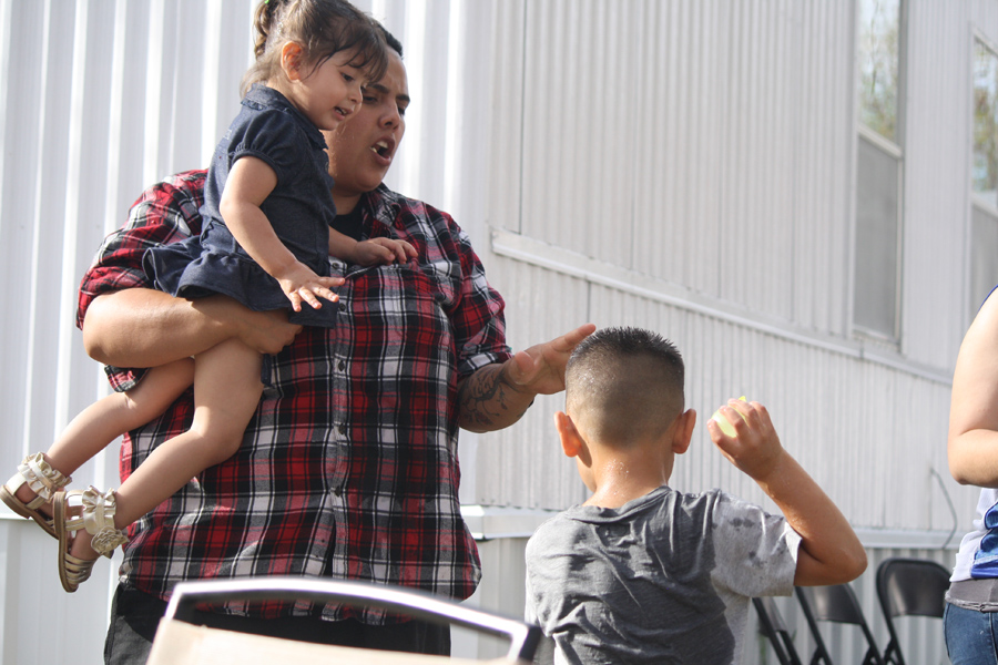 Easter Sunday in Española, New Mexico in 2015. Here, Buddy has destroyed a water balloon, connecting. The water spray comes as the balloon shatters.